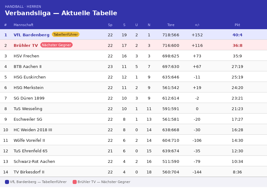 Durch den Erfolg verteidigt der VfL die Tabellenführung in der Handball-Verbandliga Nordrhein. Gleichzeitig ließ Verfolger Brühl in Merkstein Punkte liegen, wodurch der Vorsprung der Bardenberger auf vier Zähler anwächst – bei noch vier ausstehenden Spielen.